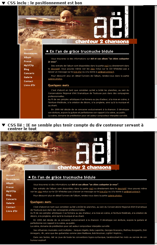 J'ai commencé en laissant le css inséré dans le code htm - jusque la, tout allait bien - et une fois ma mise en page finie, j'ai choisi de mettre mon css dans un fichier externe et de le lier à la page htm.. et la , IE me pete un cable et semble ne plus prendre en compte les div (sous FF je n'ai pas ce souci).
